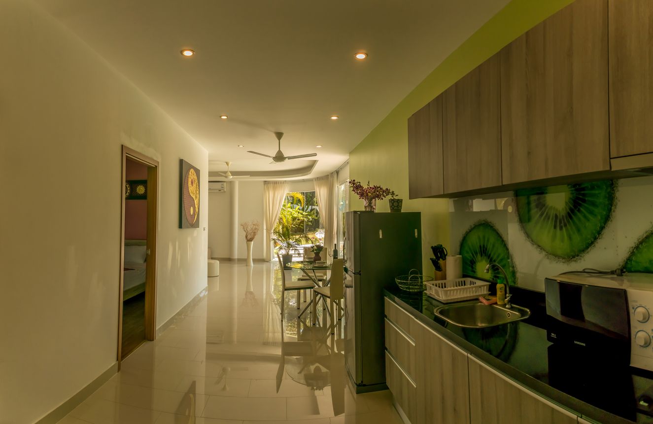 2 спальни, 1 ванная комната, полностью оборудованная кухня, гостиная, терраса, кондиционеры, кабельное ТВ, WiFi, общий бассейн и сад